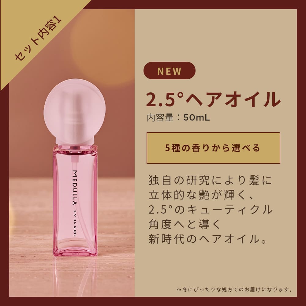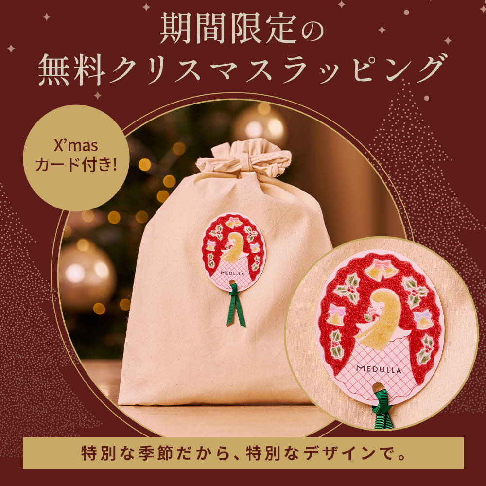 2025年10月15日(水)〜11月4日(火)までにご注文いただいた先着500名様に先行予約特典として、香りのお試しや旅行に便利なシャンプー&リペアのミニボトル(5セット)+MEDULLAオリジナルショッパー&オーナメントをコフレとセットでお届けします。ご注文はお早めに!