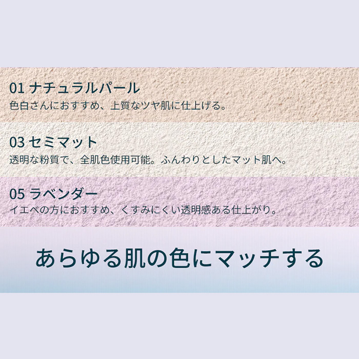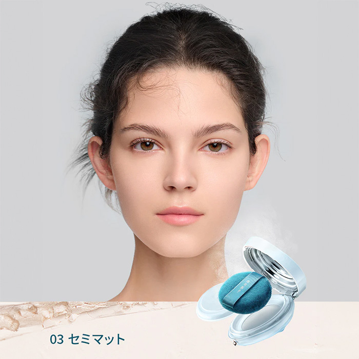 03 セミマット:透明な粉質で、全肌色使用可能。ふんわりとしたマット肌へ。